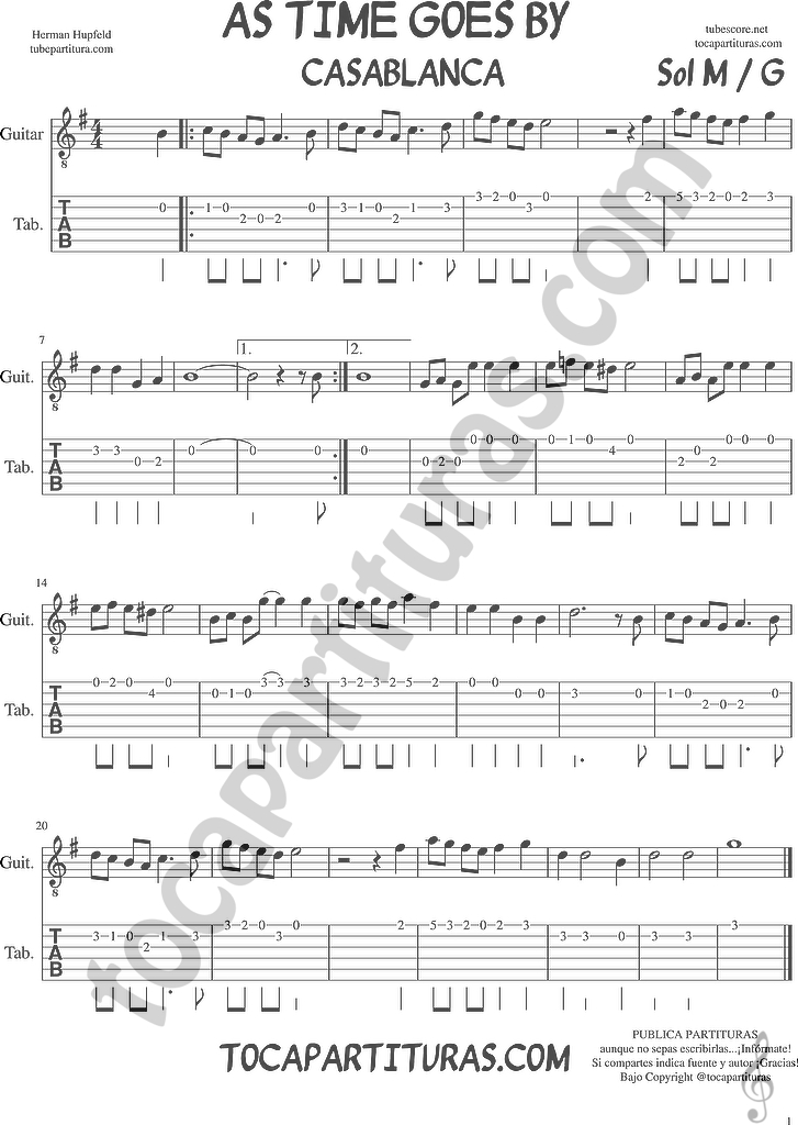 tubescore: As Time Goes by Tab Sheet Music for Guitar in G