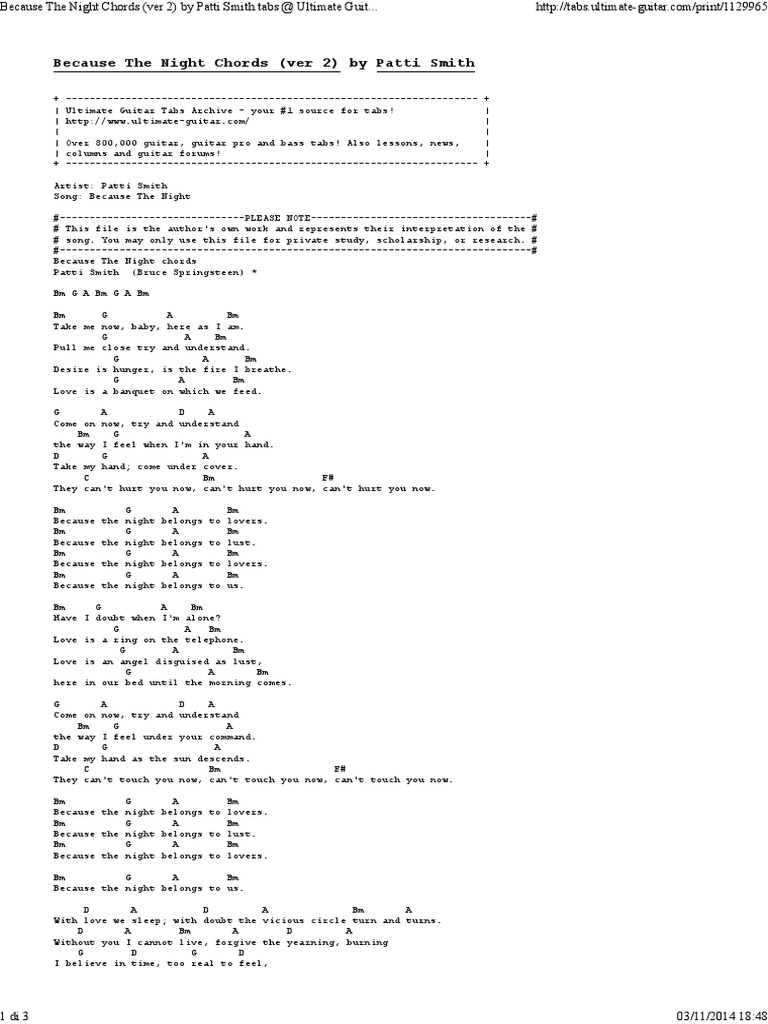 Because the Night - Patti Smith - Free Sheet Music & Tabs