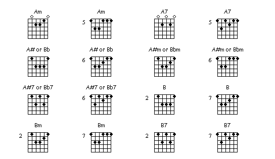 Barre chords (major and minor) chart for guitar