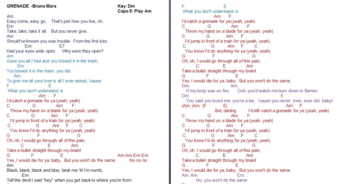 Grenade by Bruno Mars - Guitar Chords/Lyrics - Guitar