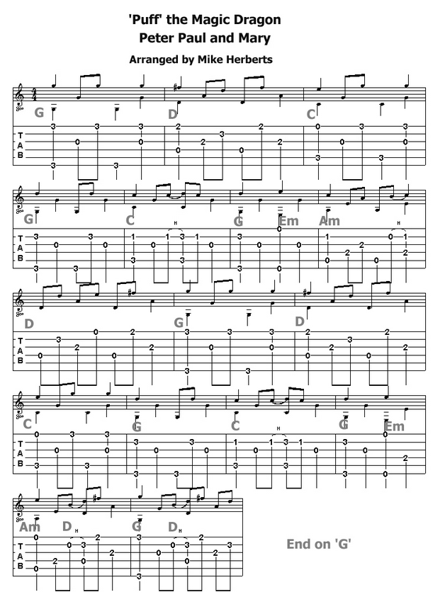 Guitar Tab and sheet music for Puff, The Magic Dragon