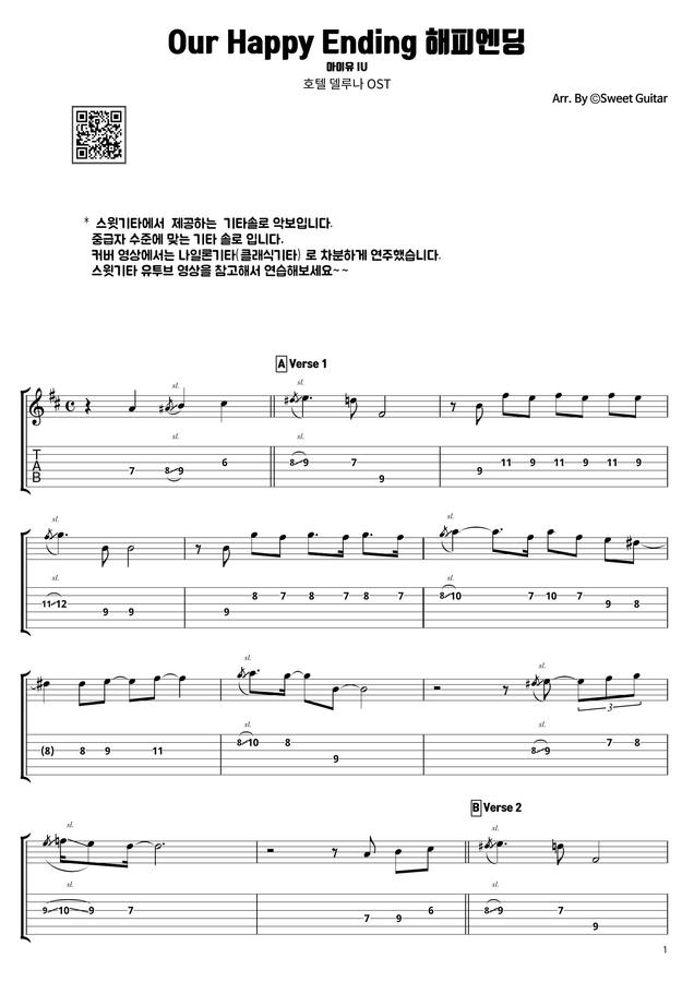 아이유 IU - Our Happy Ending 「기타 코드, 솔로」 타브악보 Chords Tabs