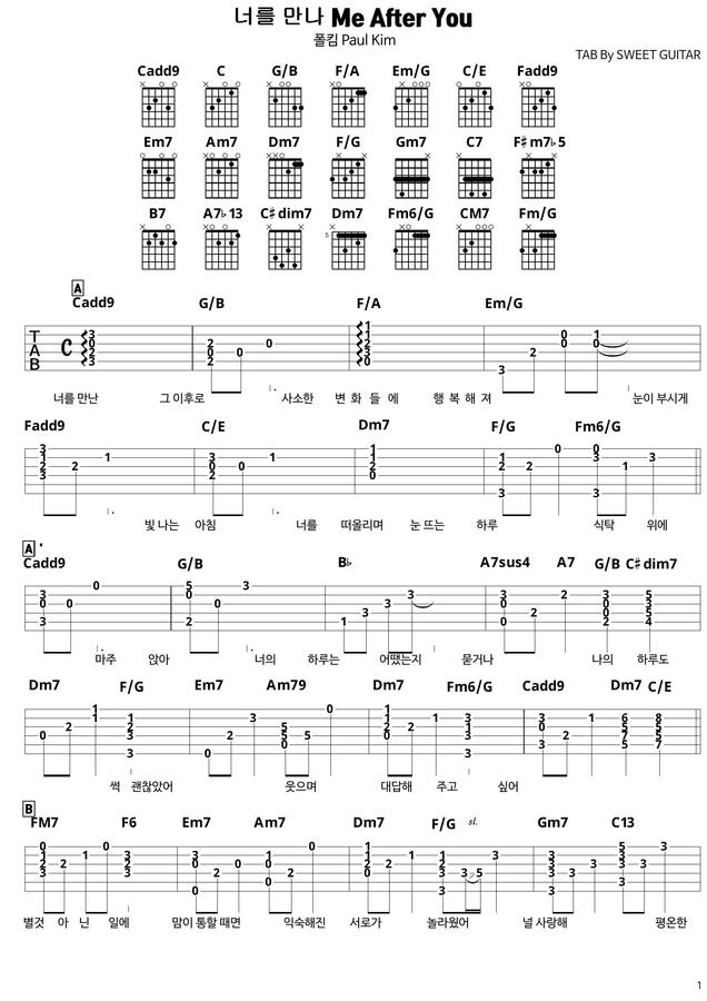 Sweet Guitar (스윗기타) > 너를 만나(Me After You) 기타 타브,코드악보ㅣ 폴킴