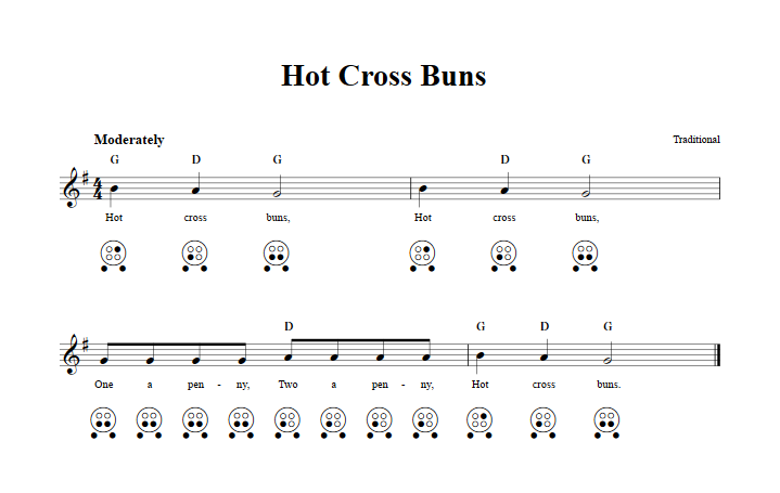 Hot Cross Buns: Chords, Sheet Music, and Tab for 6 Hole