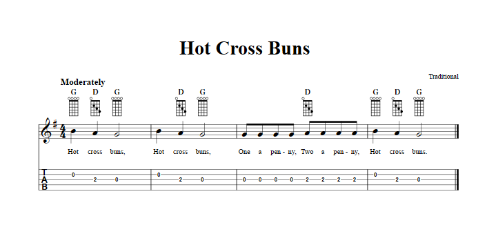 Hot Cross Buns: Chords, Sheet Music, and Tab for Guitar