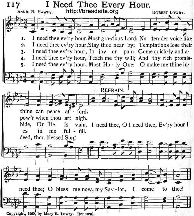 Methodist Hymn: I Need Thee Every Hour - lyrics with PDF