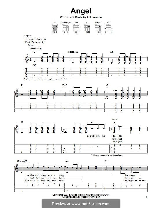 Jack Johnson "Angel" Guitar Tab - Download & Print