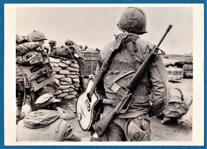vintage photo US Marine soldier w M 16 gun & guitar Khe
