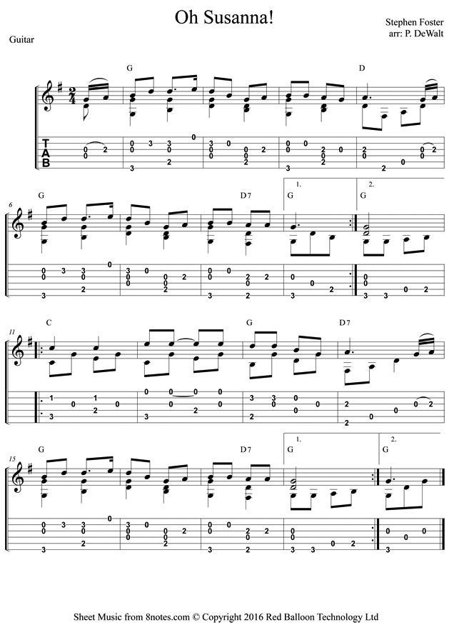 Oh! Susanna: Chords, Sheet Music, and Tab for Guitar with