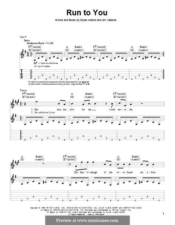 Run To You Sheet Music | Bryan Adams | Guitar Tab