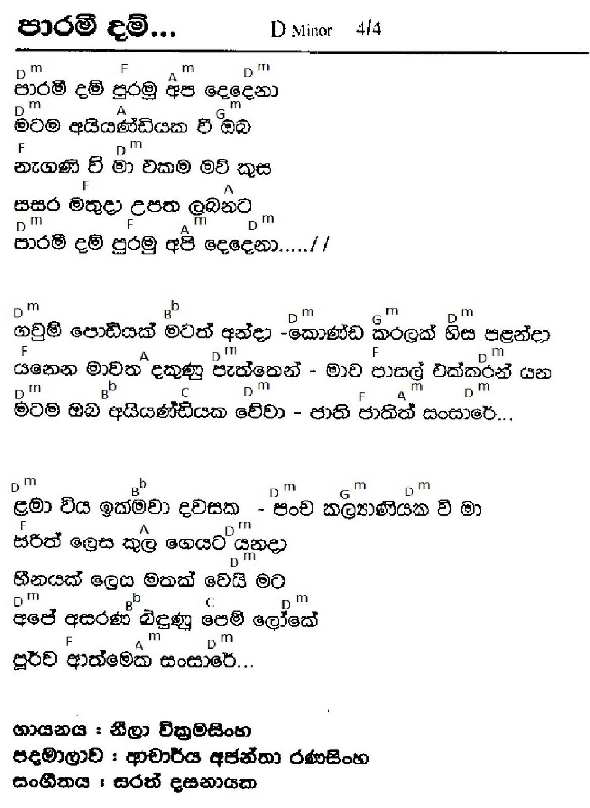 SINHALA SONGS LYRICS WITH MUSIC CHORDS: පාරමී දම් - නීලා