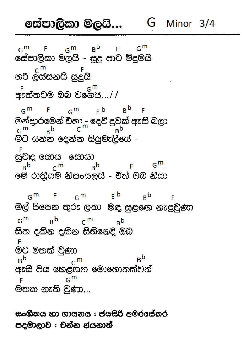 SINHALA SONGS LYRICS WITH MUSIC CHORDS: සේපාලිකා මලයි