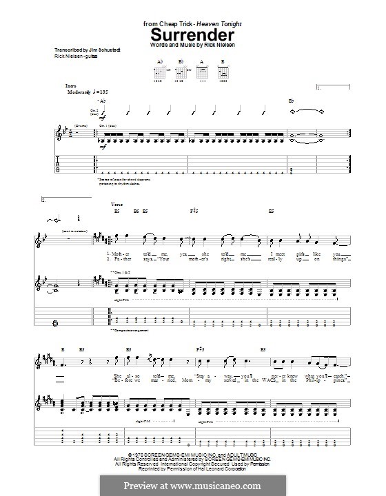 Surrender Sheet Music | Cheap Trick | Guitar Chords/Lyrics