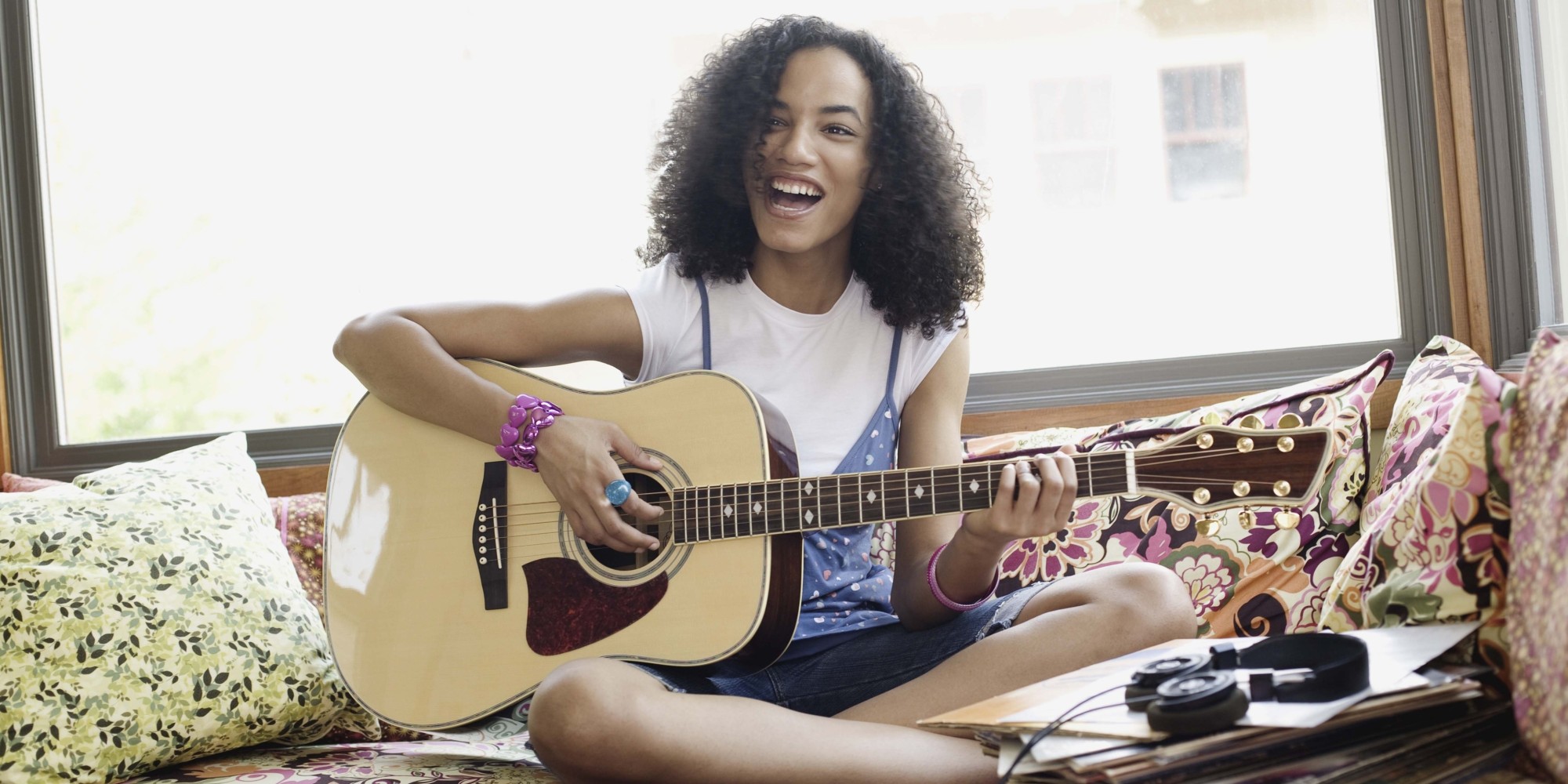 Happy teenage girl playing guitar at outdoors Photo | Free