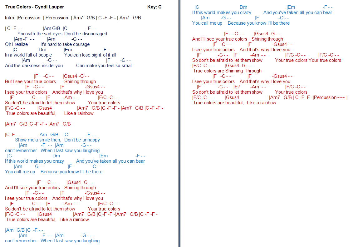 Song lyrics with guitar chords for True Colors