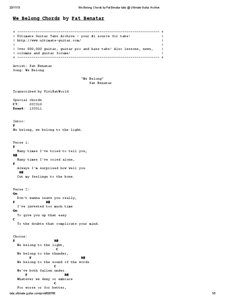 We Belong Chords by Pat Benatar Tabs @ Ultimate Guitar