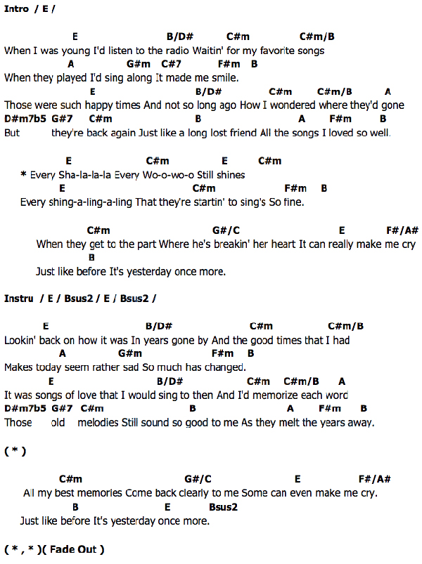 Song lyrics with guitar chords for Yesterday Once More